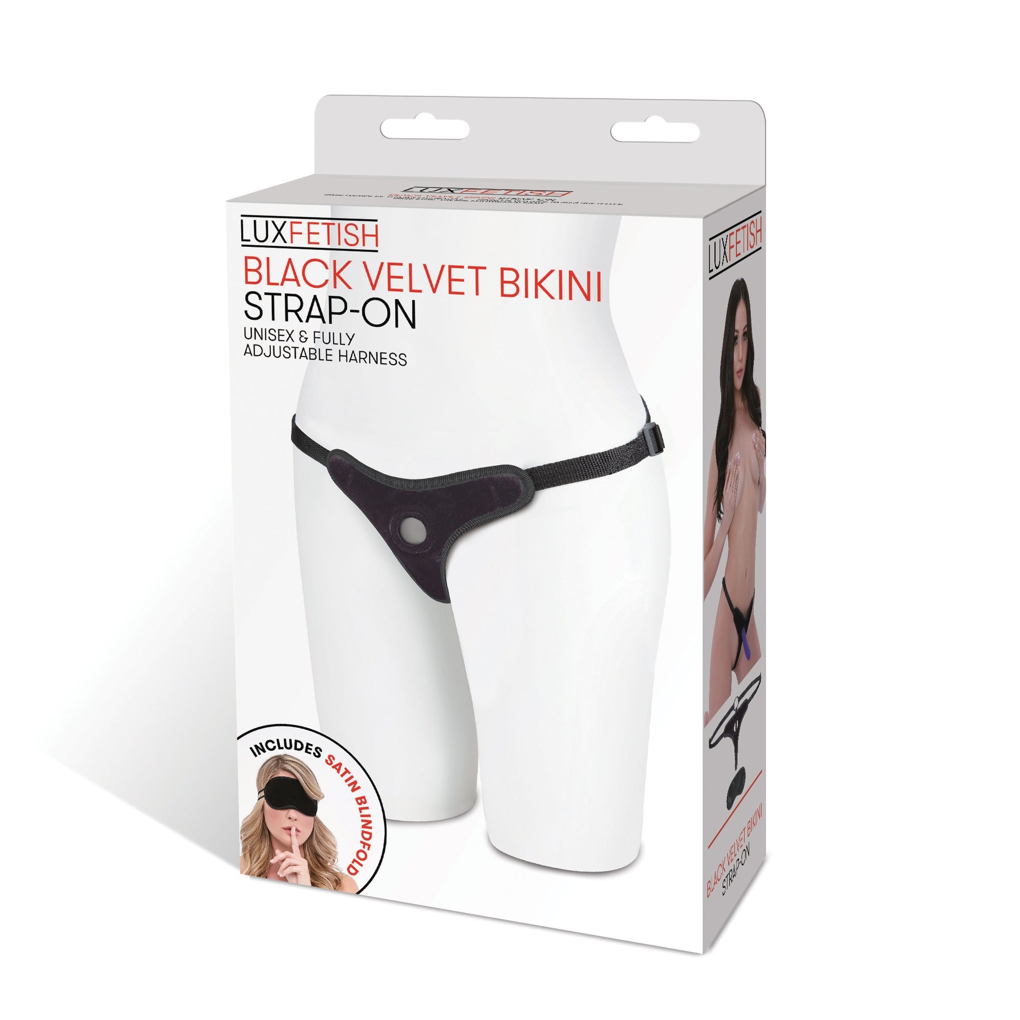 This sleek black velvet harness puts you in control with a revealing bikini cut that shows off your body. Fully adjustable straps accommodate waists up to 65", making it genuinely accessible for different bodies and experience levels. The built-in 2" O-ring securely holds any flared-base dildo, keeping your focus on pleasure rather than repositioning. Soft polyester with a velvet finish feels luxurious against skin, while the thong-style back keeps movement unrestricted. The included satin blindfold opens up sensory play possibilities for you and your partner.