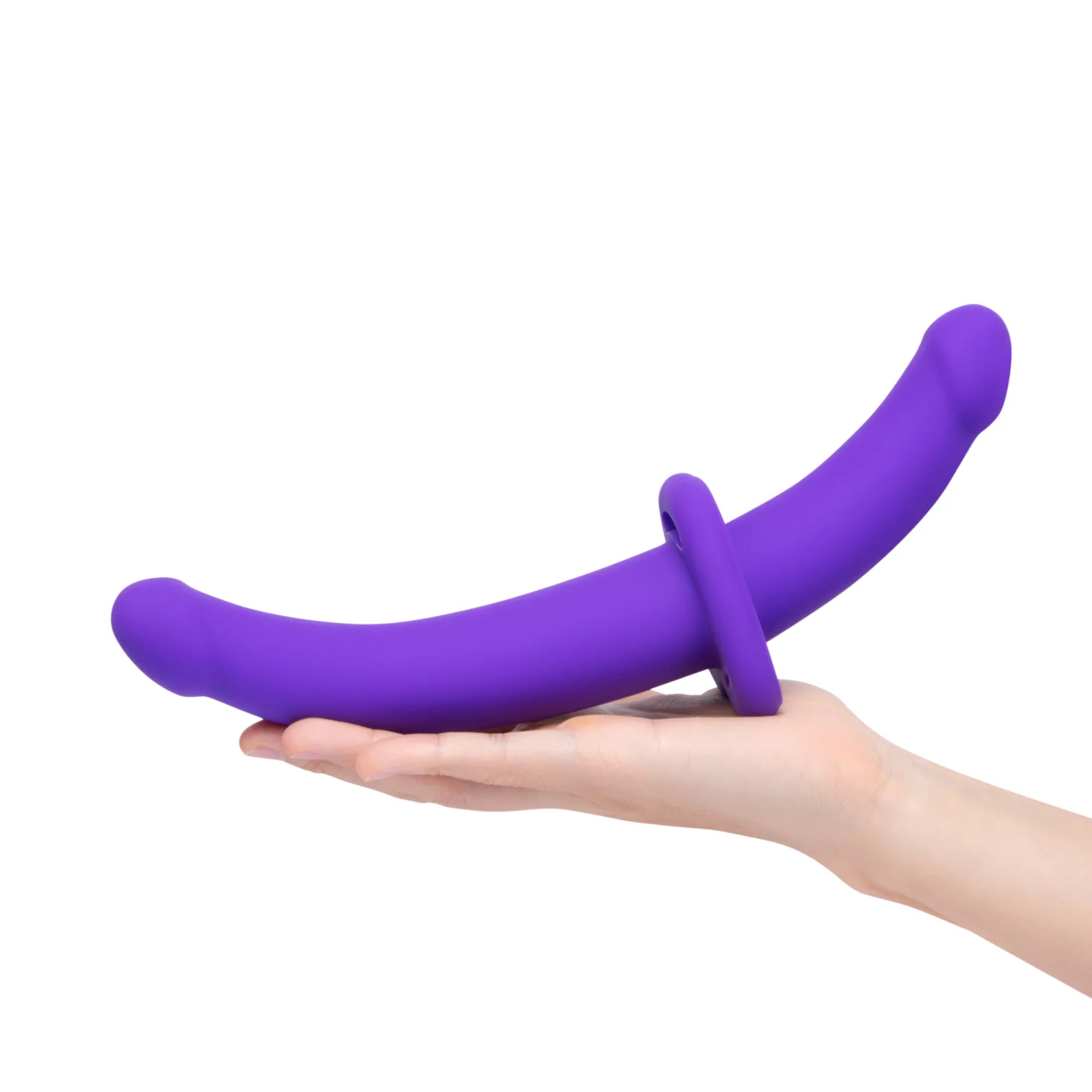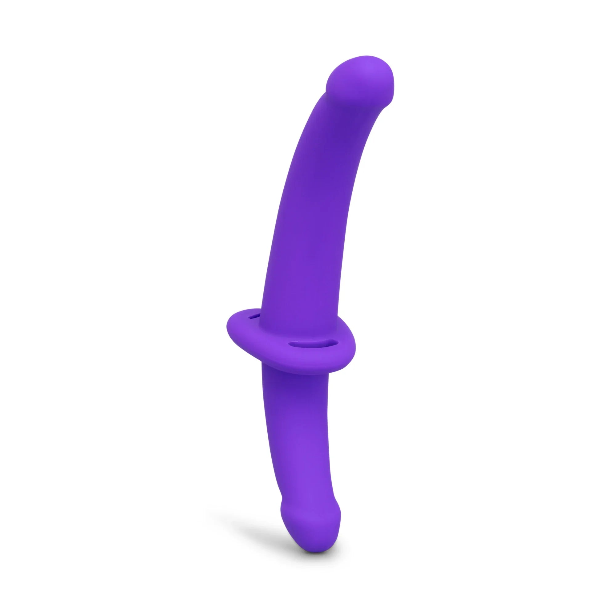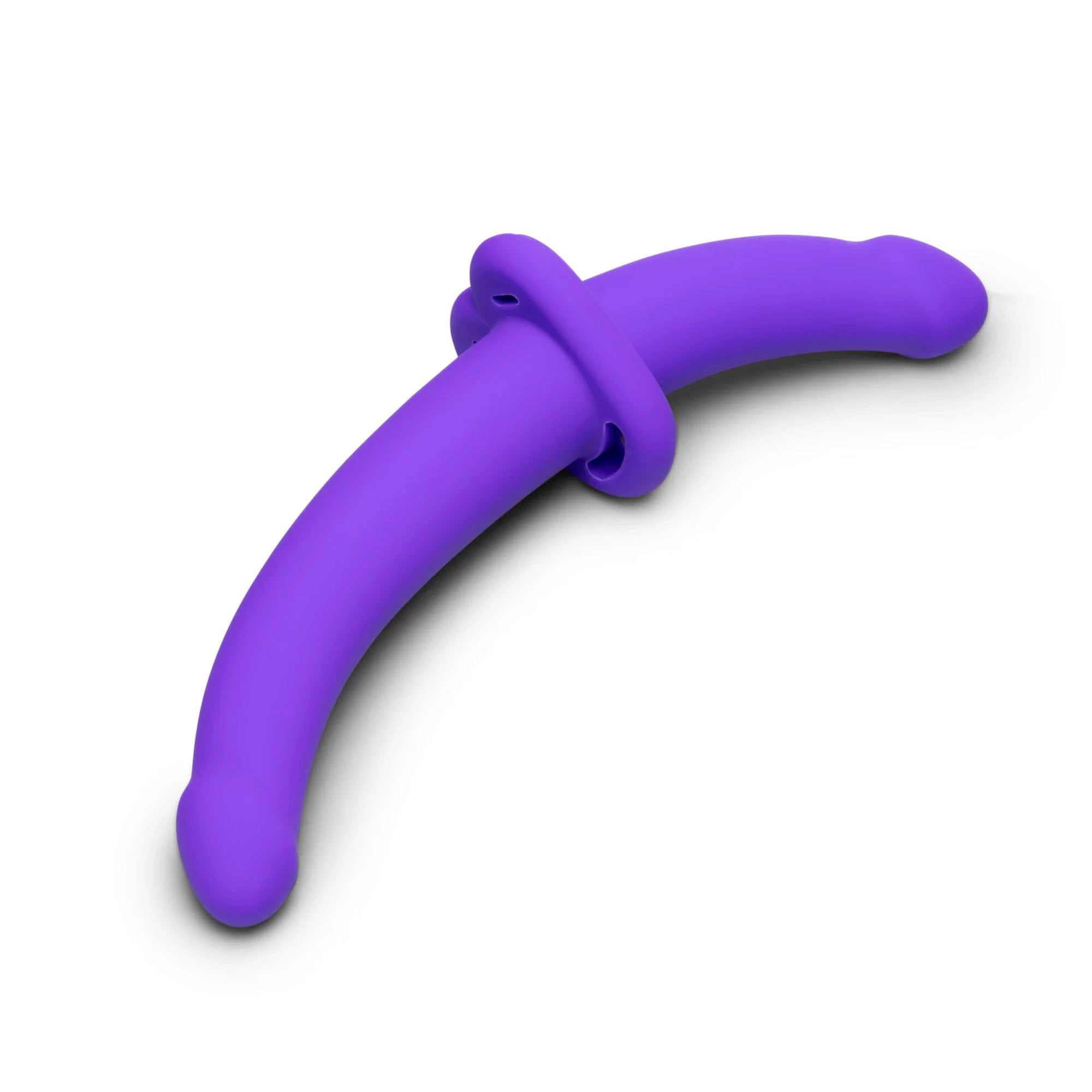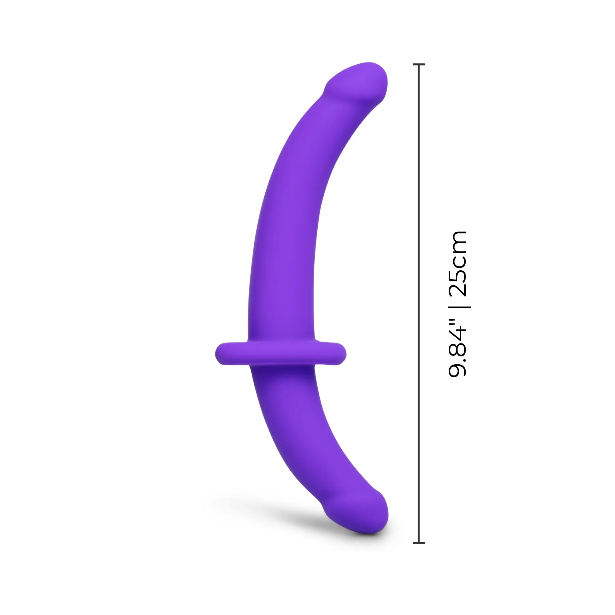 This double-ended dildo brings mutual penetration into your strap-on play. The wearer takes 5 inches internally while delivering 7 inches of curved silicone to their partner. Both shafts share a flared base that anchors into the included adjustable harness, holding everything secure while you thrust. The gentle curves target your pleasure spots, and the beginner-friendly 4.5-inch circumference keeps things comfortable for both bodies. Whether you're exploring pegging or deepening your strap-on repertoire, this set delivers shared sensation with a fit that works for waists up to 65 inches.