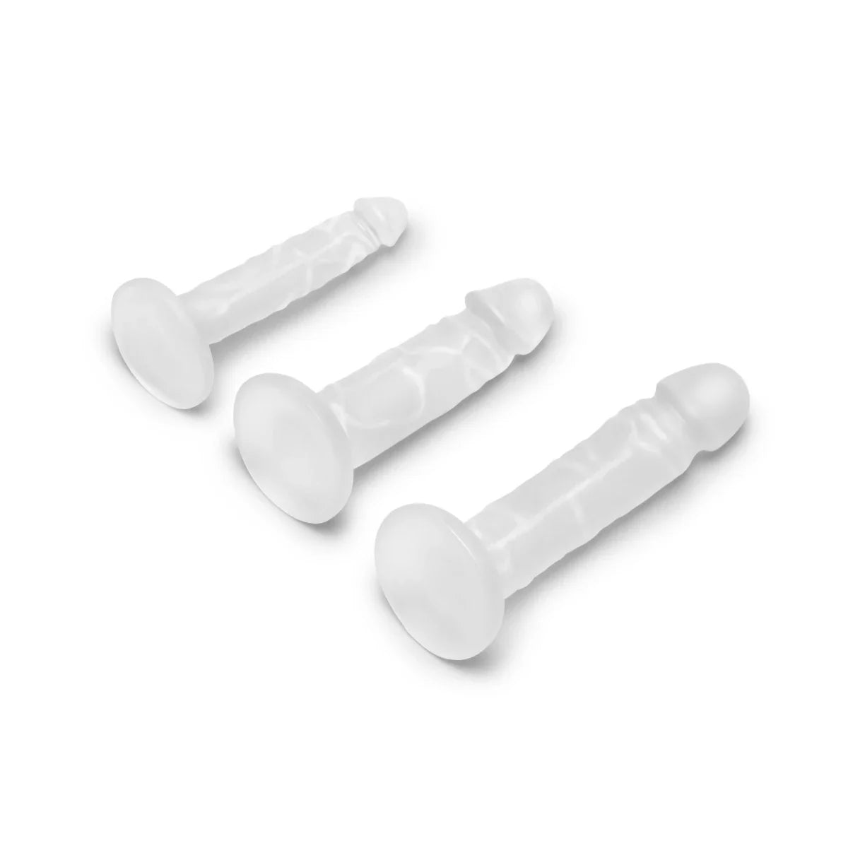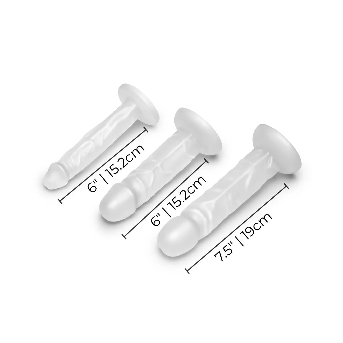 - Three dildos: slim 6 inch and girthy 6 and 8 inch