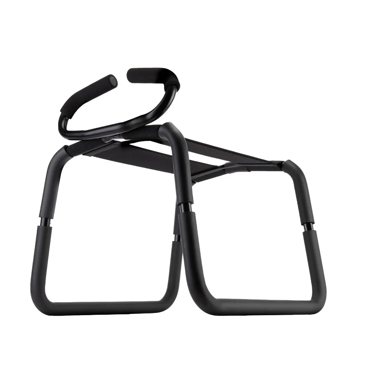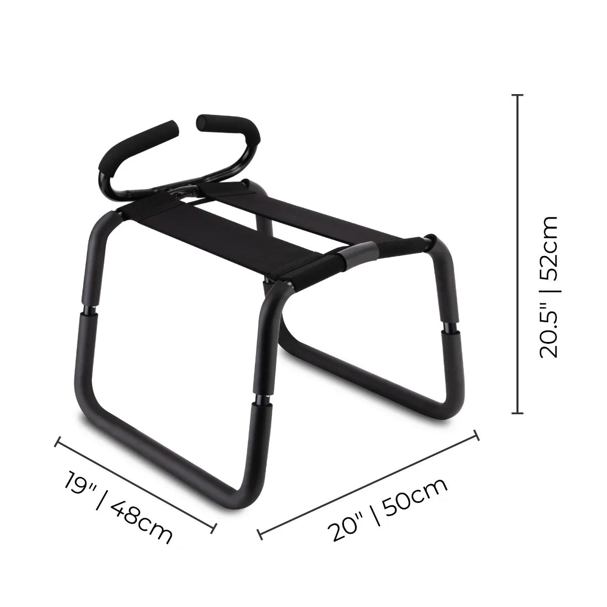 Every position becomes possible with this supportive sex chair, designed for exploration and stability. The sturdy metal frame with cloth and elastic supports holds up to 440 pounds, whether you're solo or sharing the experience. Flatpack construction means quick setup and discreet storage under the bed or in a closet. The included handles give you leverage for positioning, grinding, or holding on during intense moments. Perfect for pairing with suction-cupped dildos or sex machines, this chair opens up new angles and possibilities for queer pleasure.
