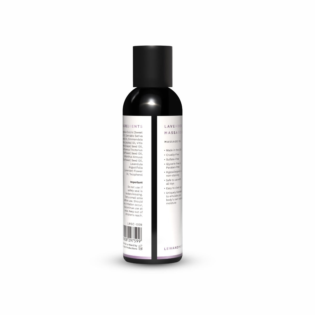 Indulge in the art of touch with Le Wand Lavender Massage Oil, a hydrating blend that glides effortlessly over skin. Infused with soothing lavender, this versatile oil is perfect for intimate massages, slow foreplay, or as a moisturizing lube during sex. The formula emulates your body's natural moisture, making it safe for sensitive areas and compatible with all wand massagers and toys. Blend of sweet almond, hempseed, jojoba, grape seed, safflower, and sunflower oils delivers lasting hydration, leaving skin soft and irresistibly touchable. Whether exploring solo or with a partner, this luxurious oil enhances connection and pleasure.