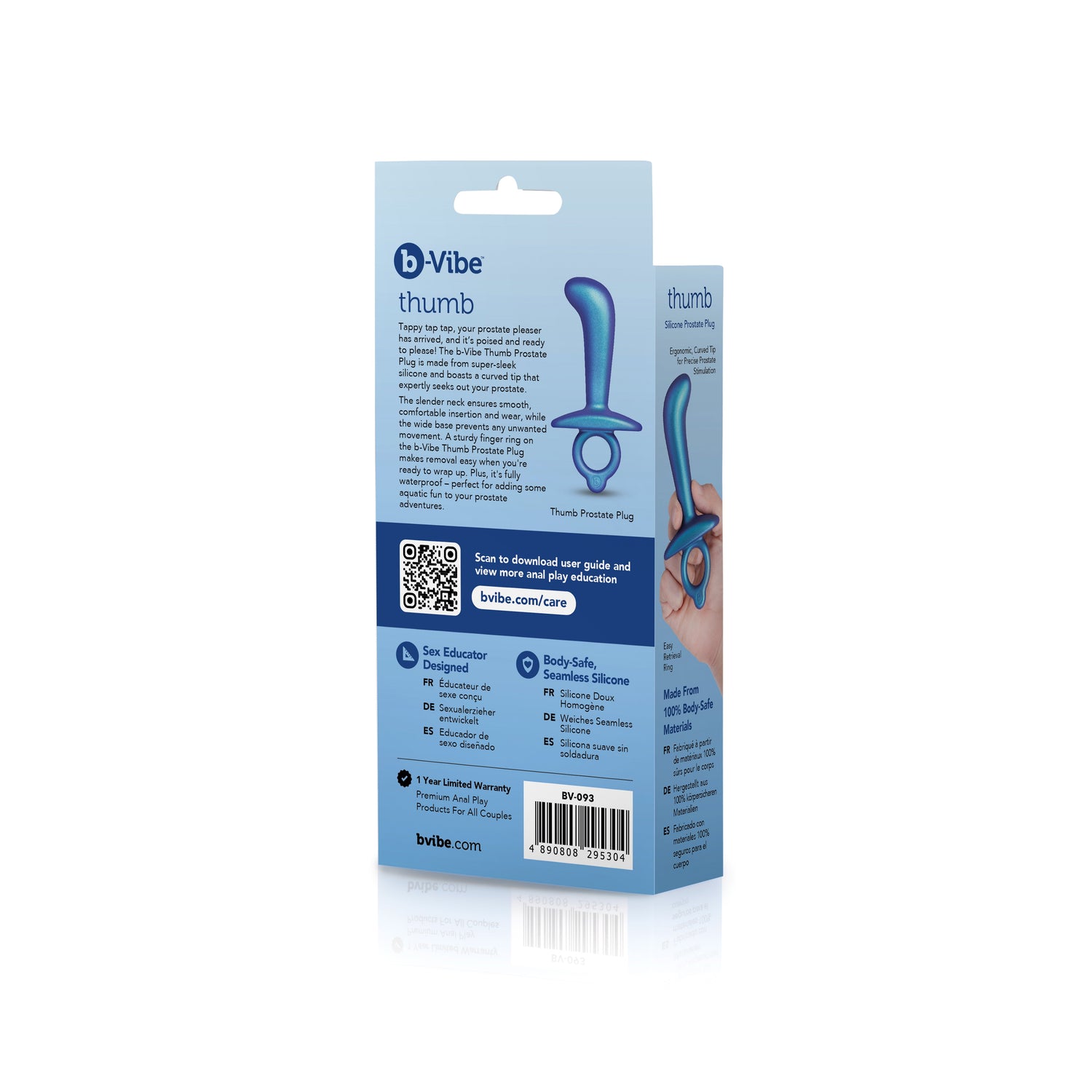 The b-Vibe Thumb Prostate Plug is designed with precision - a curved tip that seeks out your prostate with expert accuracy, wrapped in super-sleek silicone that glides into place. The slender neck ensures you can wear it comfortably for extended play, while the wide base keeps everything secure and stable. When you're ready to finish, the sturdy finger ring makes removal smooth and controlled. Fully waterproof, it's ready for shower sessions or easy cleanup, bringing straightforward functionality to your prostate exploration.